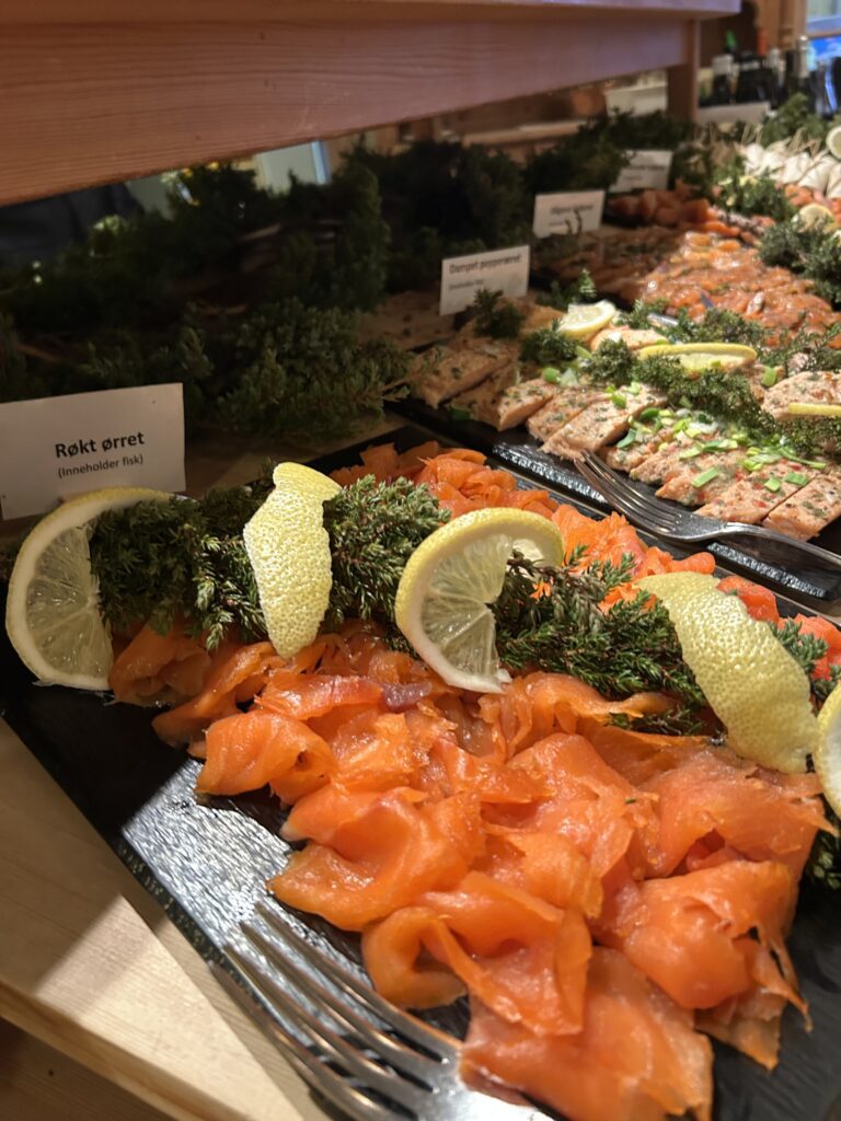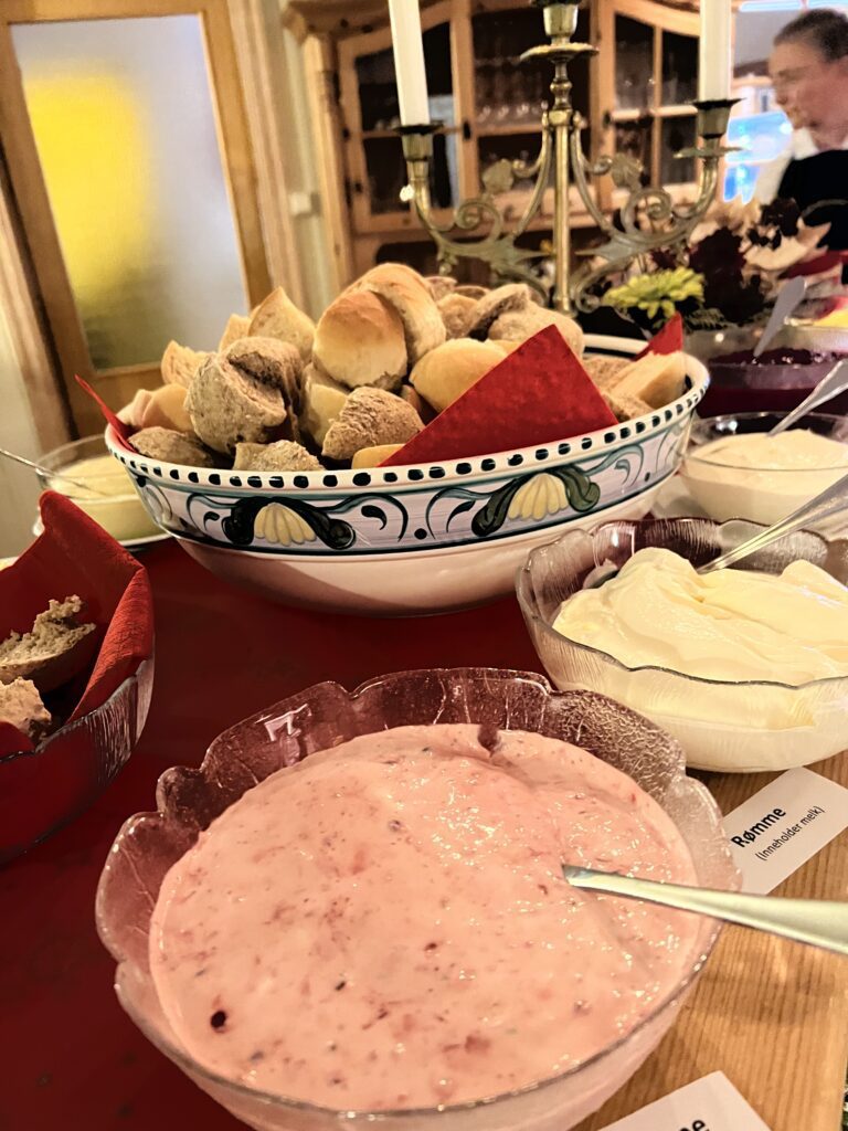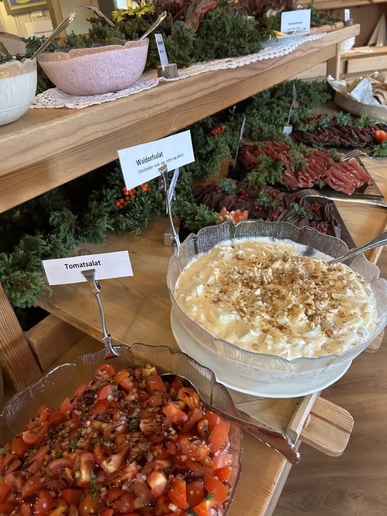 På frokostbuffeten serveres det hjemmebakt brød og rundstykker med ulike type pålegg som syltetøy, kjøttpålegg, gulost/brunost med mer. I tillegg til knekkebrød, frokostblandinger, kokte egg, grønnsaker m.m.