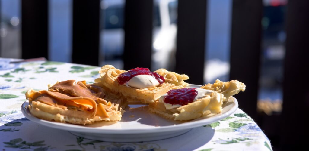 Smak våre kjente og hjemmelagde kanelboller og nystekte vafler.